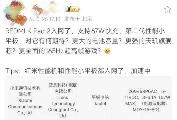 从已知信息来看,这是一款主打电竞游戏的小平板,为红米K Pad的迭代居品,将于4月份(约略率下旬)发布。
