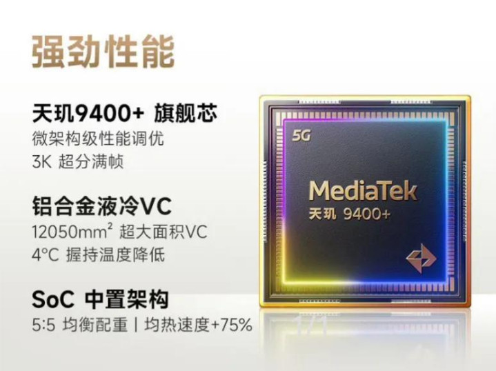 性能方面,安兔兔跑分超400万,比前代搭载的天玑9400+有比拟大的擢升。
