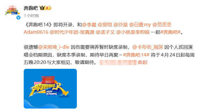 3月25日,热点综艺《奔走吧》官方账号负责发布公告,官宣本季节目次制气势出现变动,宋雨琦因头部受伤需要诊疗体魄,暂时缺席节目次制,同期周深因个东谈主巡回演唱会档期破损,也将缺席本季录制,官方发文抒发缺憾之余,也期待两位嘉宾能早日与节目再聚。音问还是发布,飞快激发网友热议,公共在对节目默示期待的同期,也纷繁怜爱宋雨琦的体魄气象,但愿她能放下责任安祥养伤,早日康复追忆。