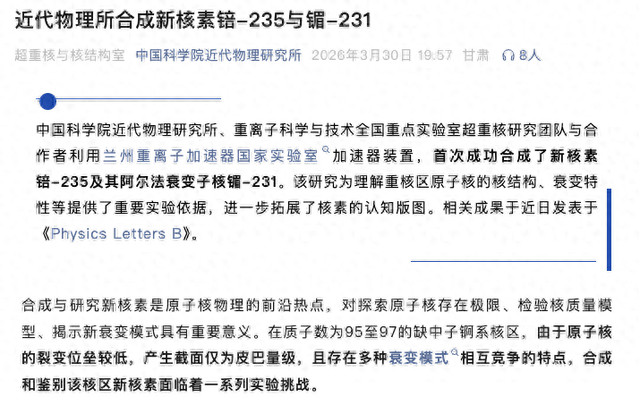 2026世界杯 你的位置:IM体育官方网站首页 > 2026世界杯 > IM体育官方网站 我国科学家合成新核素锫-235与镅-231