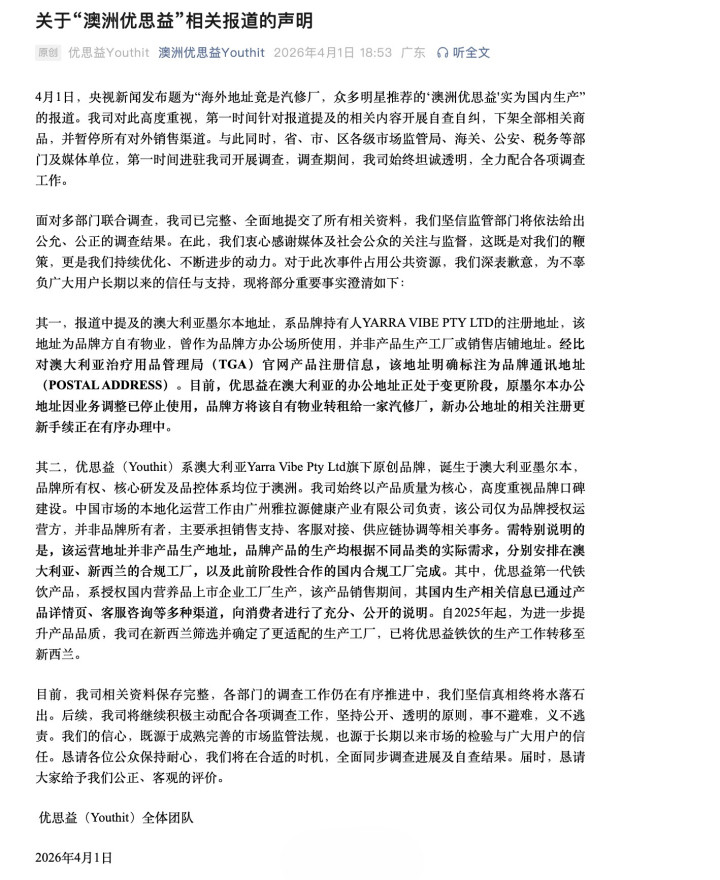 大象新闻记者以世俗耗尽者身份,照应了与辉同业客服。商量未开封的优念念益能否退货,客服回复则是让检讨品牌方声明。而优念念益官方声明中称,涉事品牌标注的在澳大利亚的地址仅为通信地址,并非工场,IM体育已下架沿途商品并协作监管看望,并未说起耗尽者退货退款有谋略。