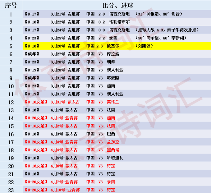 按照谋略,中国U-16男足、U-16女足齐将厚爱开辟蒙太古杯之旅,男足将在4月1号迎战法国、3号靠近巴西、5号过招科特迪瓦,7号迎来排位战。女足则是本月31号对阵英格兰、4月2号遇到法国,4月4号过招墨西哥,4月6号恭候排位赛。相称于从3月31号到4月7号一天一场。