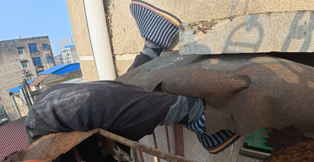老东说念主的右腿卡在遮阳棚内。图源:湖北消防
