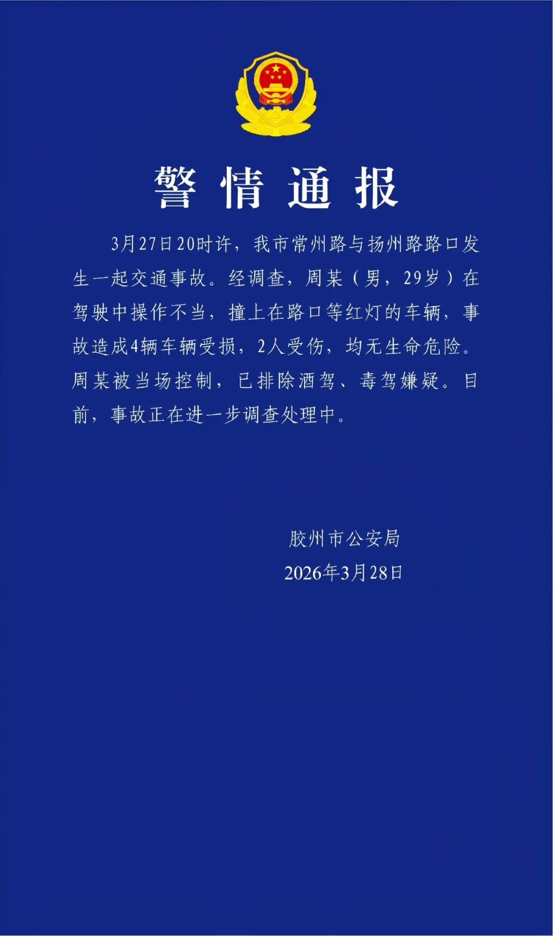 胶州市公安局发布警情通报:3月27日20时许,胶州市常州路与扬州路路口发生沿途交通事故。经访问,周某(男,ag真人app29岁)在驾驶中操作欠妥,撞上在路口等红灯的车辆,IM体育官网事故酿成4辆车辆受损,2东谈主受伤,均无生命危机。周某被就地为止,已摒除酒驾、毒驾嫌疑。现在,事故正在进一步访问贬责中。