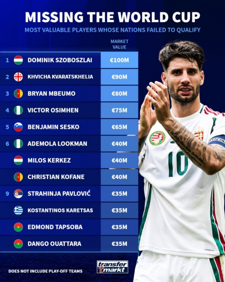 无缘本年寰宇杯球员身价名次(场地球队未晋级,不包含附加赛球队):