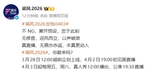 3月27日,综艺节目《乘风2026》公开嘉宾声势,秘书节目将于4月3日起每周五、周六,真东说念主秀12:00播出,公演19:30直播。