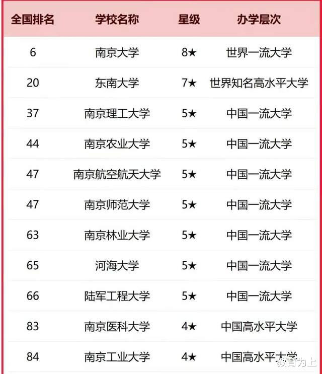 通过对南京市高校抽象实力进行量化评选,可诀别为8星级、7星级、5星级等第别,其中南京大学、东南大学、南京理工大学居榜单前3名,是南京市抽象实力最佳的大学,分别居寰宇高校第6名、第20名、第37名。
