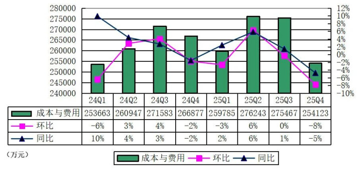 信也科技2025年第四季度老本与用度为25.4亿元,较上年同期的26.69亿元下跌5%。